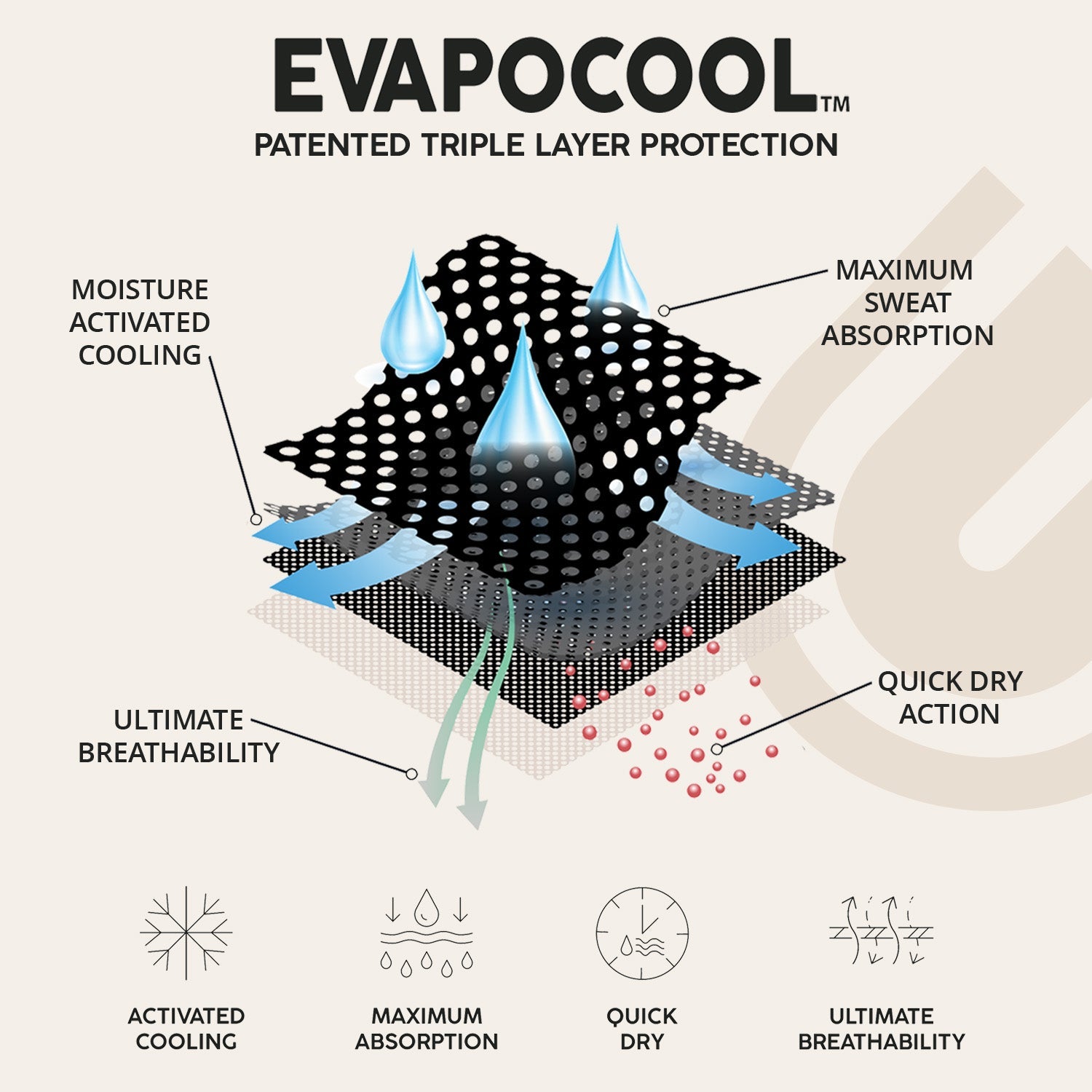 - EvapoCOOL: Our patented scientifically designed, moisture activated cooling center layer, works with joint action of heat, moisture, and air. After high-intensity exercise, hot weather, or daily sweat-inducing activities, the moisture introduced is absorbed and quickly produces a cooling effect. This can reduce skin surface temperature by 30%, lower core body temperature, and keep sweat out of your eyes for over 1 hour!
