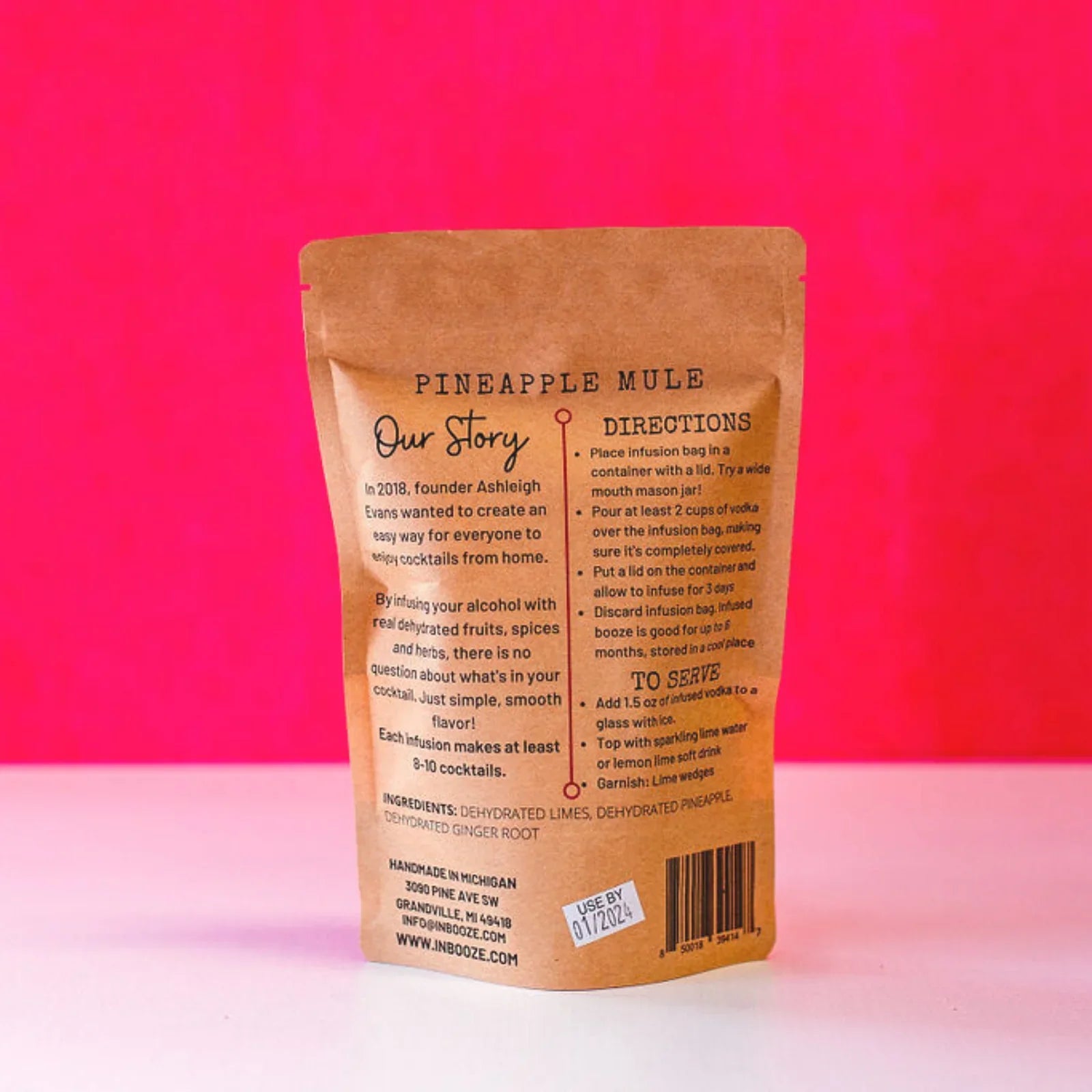 Looking for a new kind of cocktail? Each handmade InBooze™ packet contains one pouch filled with dehydrated fruits, veggies, spices and herbs to infuse your alcohol. The kit infuses enough for 8-10 cocktails...there is a flavor for everyone!