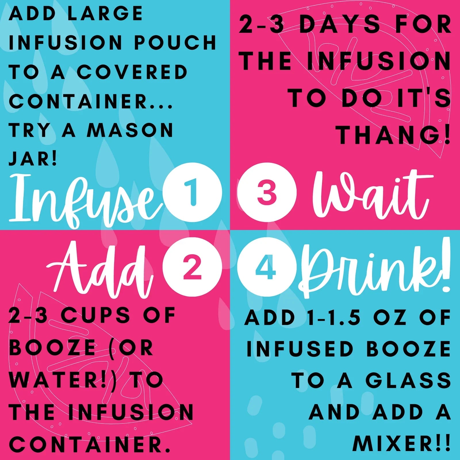 Place the infusion bag in a container, try a mason jar, and fill with your favorite alcohol. Cover and allow to infuse for at least 3 days. Remove the infusion pouch and your alcohol is ready to enjoy!